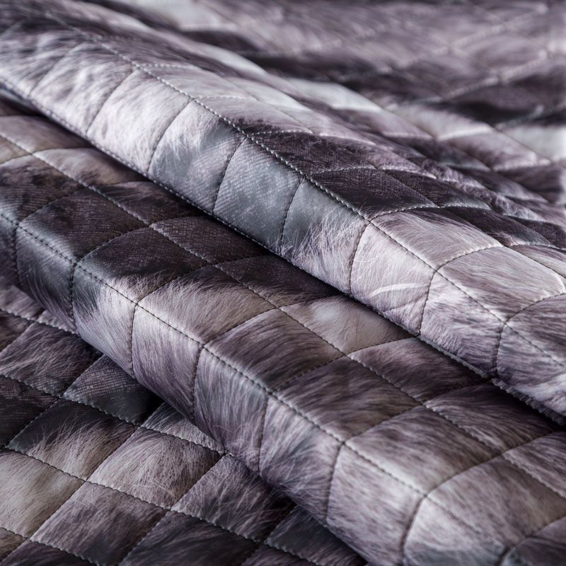 Трехслойная итальянская курточная ткань серого оттенка с принтом, имитирующим длиноворсый мех, простеганная не крупными ромбами. Нижний, черного цвета, заменяет подклад и верхний слой - полиэстер, по качеству напоминает болонь, между ними синтепон. Ткань легкая, пластичная, хорошо драпируется. Прекрасно подойдет для  пошива легких пальто, курток, бомберов, жилетов, накидок-кейпов, объемных сумок, одежды для домашних питомцев, туристического снаряжения.