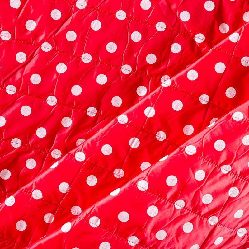 Двухслойная курточная ткань красного оттенка в белый горох, простеганная вертикальными линиями вдоль кромки. Нижний слой - синтепон, верхний - полиэстер, по качеству напоминает болонь. Очень мягкая и легкая, пластичная, хорошо драпируется. Прекрасно подойдет для пошива легких пальто, курток, жилетов, накидок-кейпов, объемных сумок.