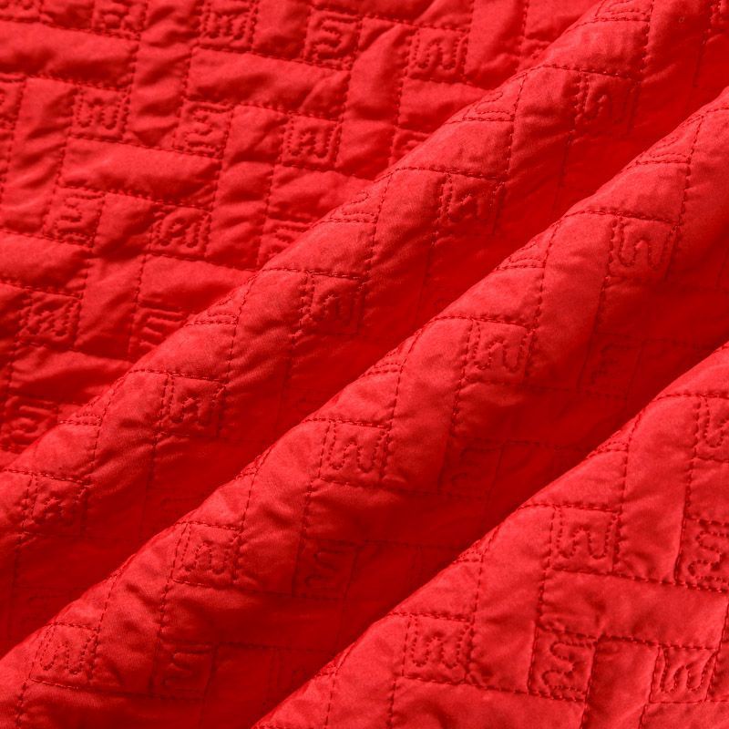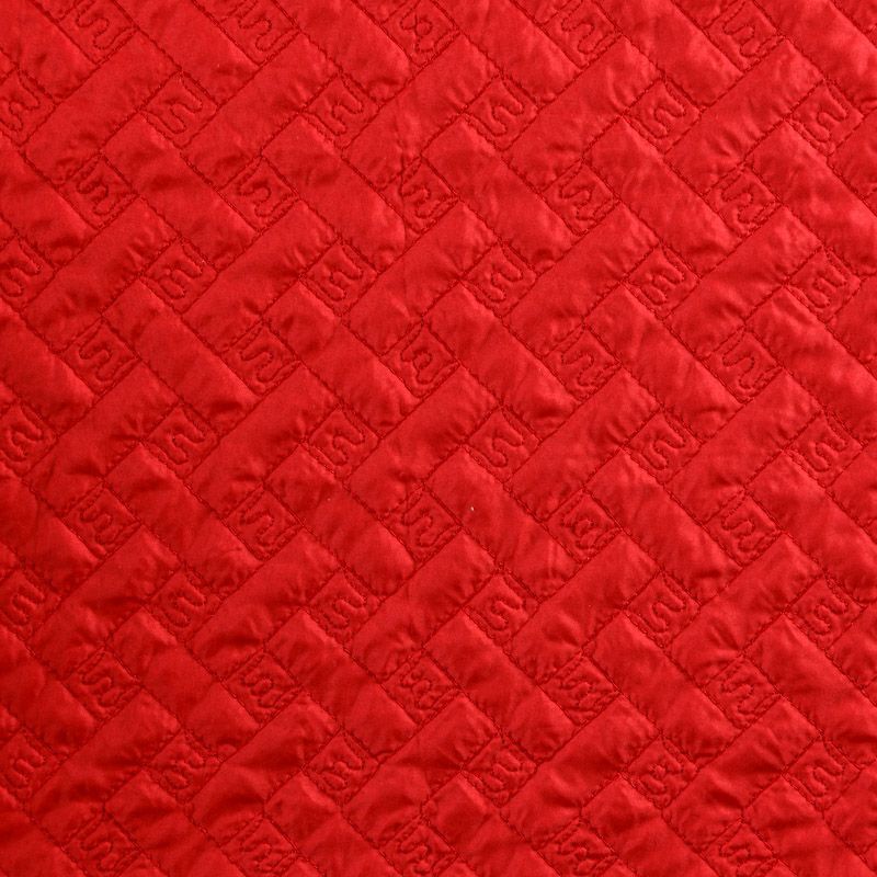 Двухслойная курточная ткань красного оттенка, с геометрической стежкой нитками в тон полотну. Нижний слой - синтепон, верхний -  полиэстер, по качеству напоминает болонь. Ткань легкая, пластичная, хорошо драпируется. Прекрасно подойдет для  пошива пальто, курток, жилетов, накидок-кейпов, объемных сумок, одежды для домашних питомцев, туристического снаряжения.