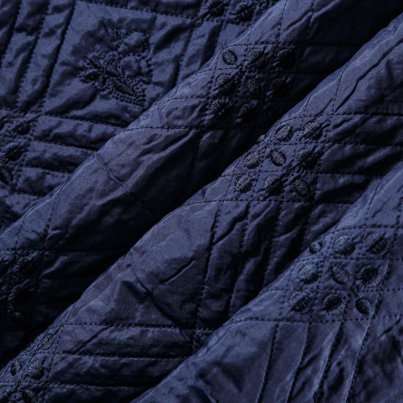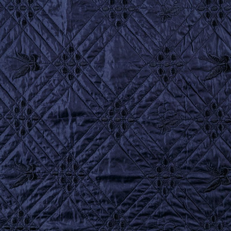 Двухслойная курточная ткань темно-синего оттенка, с геометрической стежкой и элементами вышивки нитками в тон полотну. Нижний слой - синтепон, верхний -  полиэстер, по качеству напоминает болонь. Ткань легкая, пластичная, хорошо драпируется. Прекрасно подойдет для  пошива пальто, курток, жилетов, накидок-кейпов, объемных сумок, одежды для домашних питомцев, туристического снаряжения.