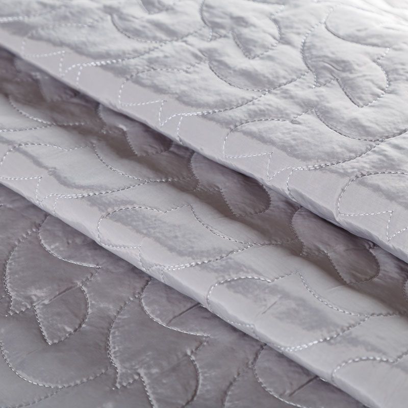Двухслойная курточная ткань светло-серого оттенка, простеганная фигурной вышивкой нитками в тон. Нижний слой - синтепон, верхний - плотный матовый полиэстер. Очень мягкая и легкая, пластичная, хорошо драпируется. Прекрасно подойдет для пошива легких пальто, курток, жилетов, накидок-кейпов, объемных сумок.