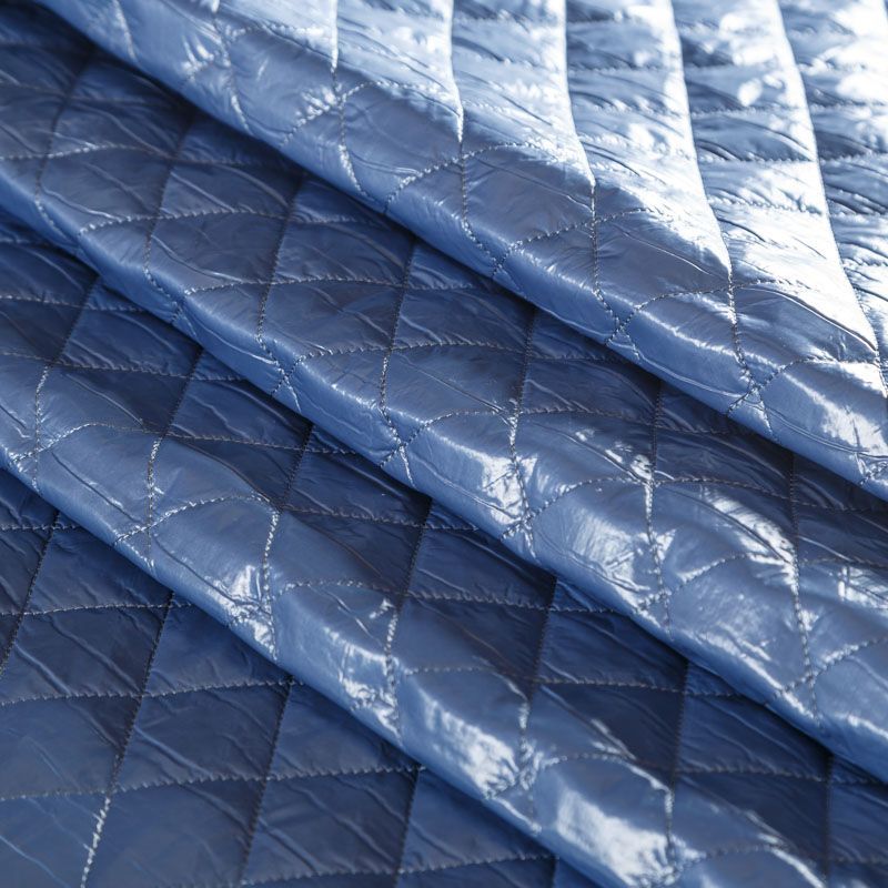 Трехслойная курточная ткань голубого оттенка, простеганная не крупными ромбами. Нижний слой - матовый фактурный полиэстер, средний - тонкий синтепон, верхний - глянцевая гладкая плащевка. Очень мягкая и легкая, пластичная, хорошо драпируется. Прекрасно подойдет для пошива легких пальто, бомберов, парки, курток, жилетов, накидок-кейпов, объемных сумок.