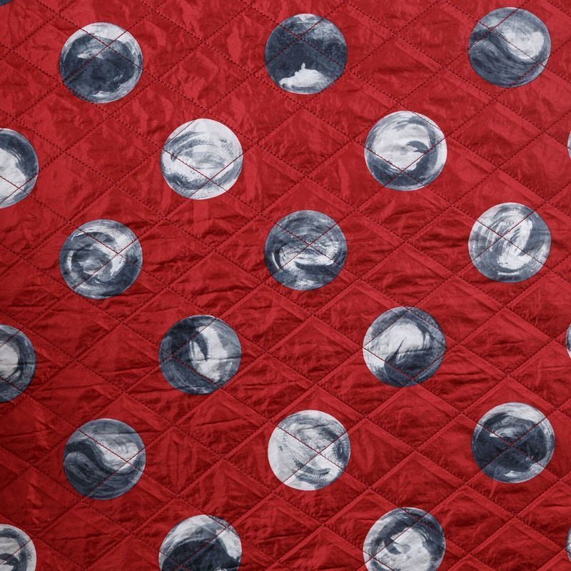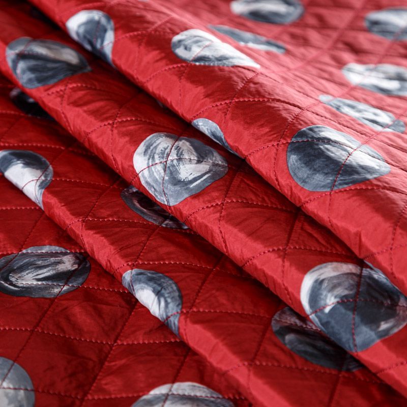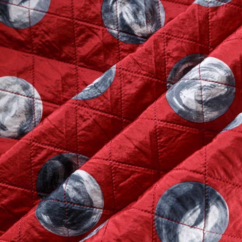 Двухслойная курточная ткань красного цвета с абстрактным принтом в черно-белой гамме, с геометрической стежкой. Нижний слой - синтепон, верхний - полиэстер, по качеству напоминает болонь. Очень мягкая и легкая, пластичная, хорошо драпируется. Прекрасно подойдет для  пошива легких пальто, курток, жилетов, накидок-кейпов, объемных сумок.