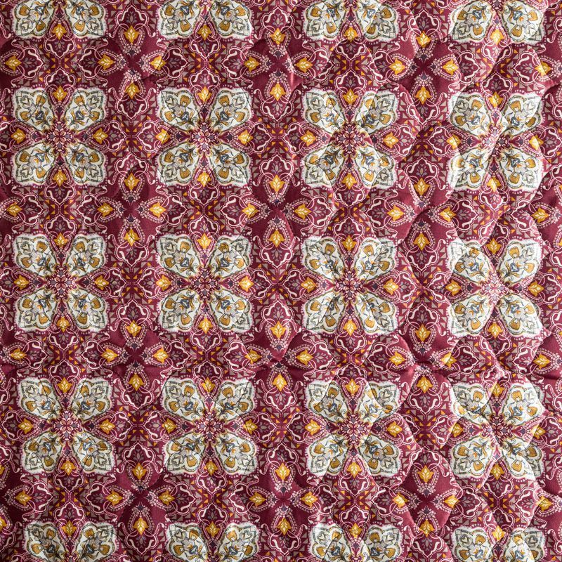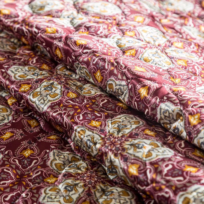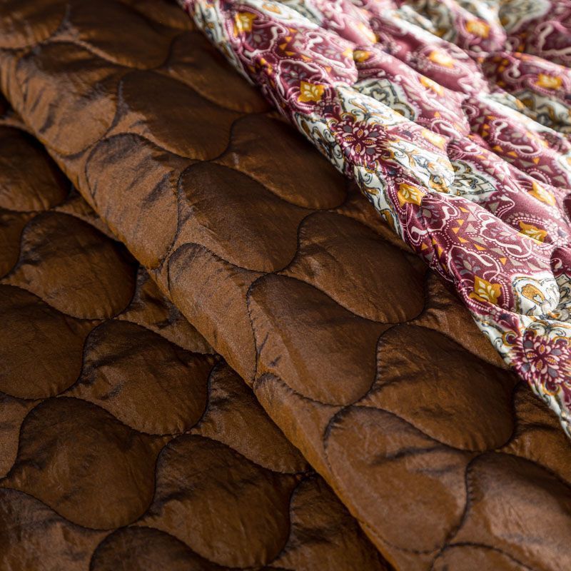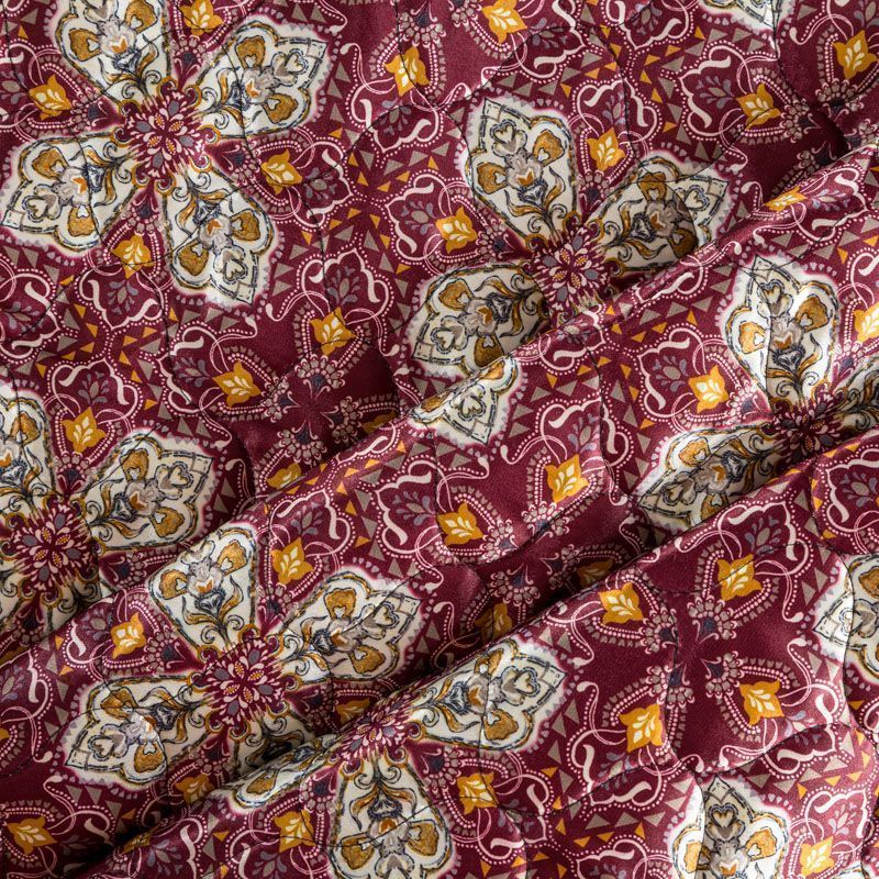 Трехслойная итальянская курточная ткань бордового оттенка с красивым сложным орнаментом, простеганная фигурными линиями. Нижний слой бронзового цвета, заменяет подклад, средний слой - синтепон, верхний слой - красочный матовый полиэстер. Ткань легкая, пластичная, хорошо драпируется. Прекрасно подойдет для  пошива легких пальто, курток, бомберов, жилетов, накидок-кейпов, объемных сумок, одежды для домашних питомцев, туристического снаряжения.