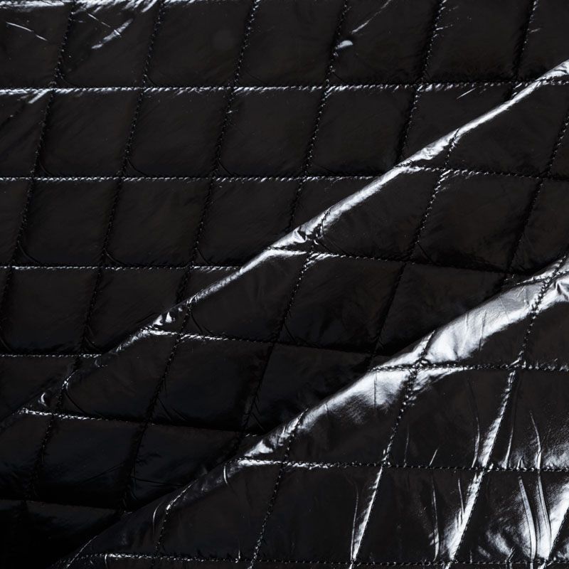 Трехслойная курточная стежка черного цвета, простеганная не крупными ромбами. Верхний слой - полиэстер, по качеству напоминающий болонь, средний слой - синтепон, нижний слой - подкладочная ткань в тон лицевой. Очень мягкая и легкая, пластичная, хорошо драпируется. Прекрасно подойдет для пошива легких пальто, курток, жилетов, накидок-кейпов, объемных сумок.