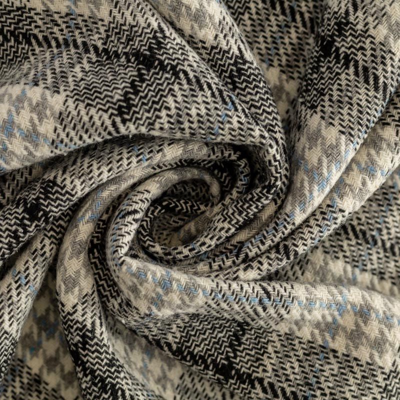 Стильная и элегантная пальтовая ткань с светлых тонах. Поверхность бархатистая, мягкая, очень приятная на ощупь, пластичная, мягко драпируется в складки, немного держит форму. Сочетание линий голубого, черного, серого оттенков и рисунка гленчек образует сложную красивую многоцветную клетку. Отлично подойдет для пошива пальто, теплых костюмов, юбки, шорт, жакета, кейпа, жилета.