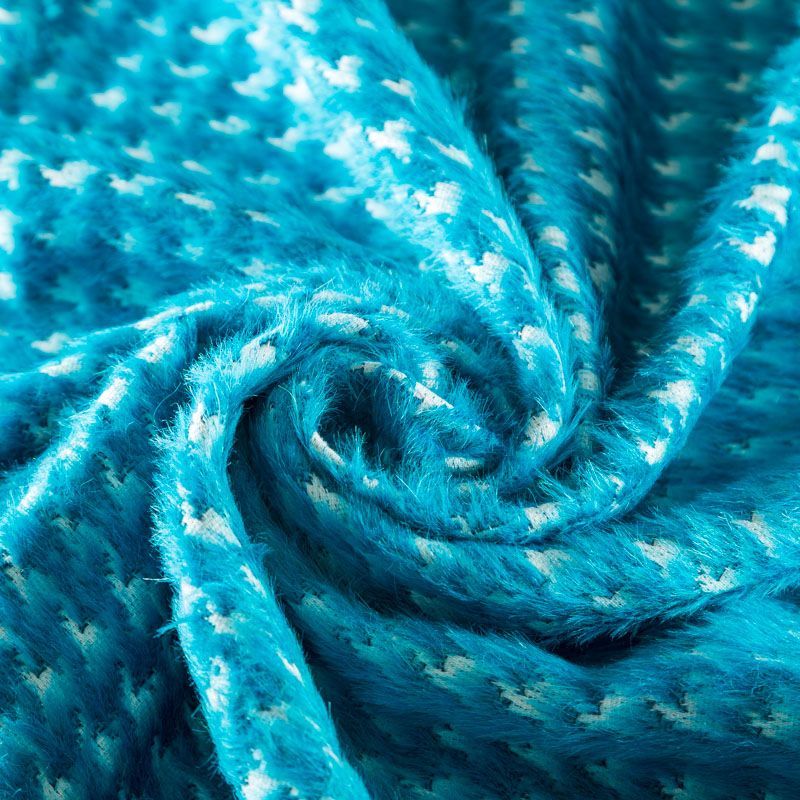 Пальтовая итальянская шерсть на хлопковой основе в ярком бирюзовом оттенке с жаккардовым узором гусиная лапка. Ткань плотная, достаточно теплая, комфортная для одежды на сезон осень-зима. Полотно имеет средний ворс. Мягкое и нежное на ощупь, не толстое и не тяжелое, хорошо держит форму. Прекрасно подойдет для пошива женских пальто, теплых костюмов, кейпов, мягких бомберов, жилетов и головных уборов.