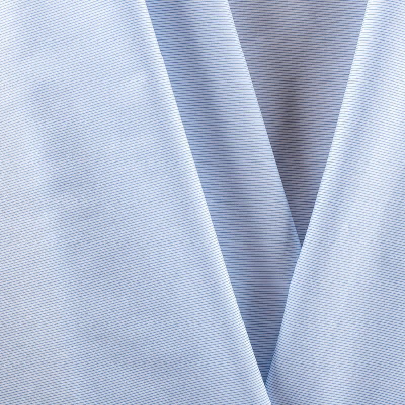 Итальянский плательно-рубашечный хлопок в тонкую полоску голубого оттенка. Ткань мягкая, лёгкая, непрозрачная, пластичная и приятная к телу, хорошо драпируется, имеет гладкую матовую поверхность и сатиновое плетение. Прекрасно подойдет как для пошива платья-рубашки, сарафана, платьев различных фасонов, туники, топа, летнего костюма, комбинезона.