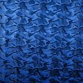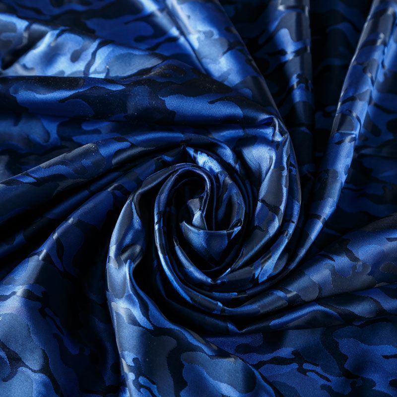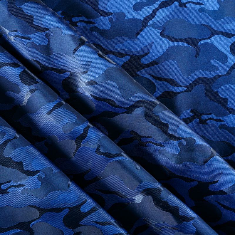 Смесовая подкладочная ткань синего оттенка с жаккардовым камуфляжным узором и красивым лоском. Полотно средней плотности, легкое, не просвечивает, хорошо скользит, не тянется. Подойдет для изготовления таких изделий, как пальто, костюмы, куртка, шуба, платье, жакет.