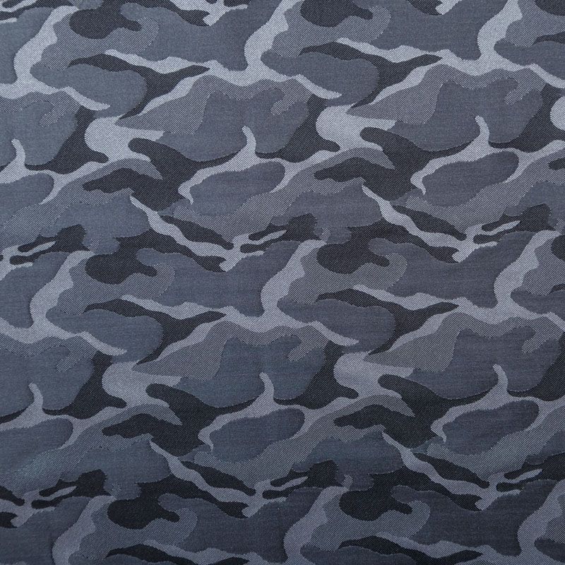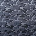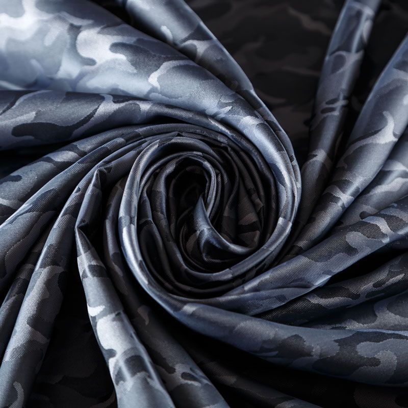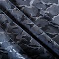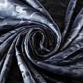 Смесовая подкладочная ткань серого оттенка с жаккардовым камуфляжным узором и красивым лоском. Полотно средней плотности, легкое, не просвечивает, хорошо скользит, не тянется. Подойдет для изготовления таких изделий, как пальто, костюмы, куртка, шуба, платье, жакет.