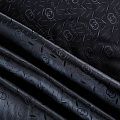 Смесовая подкладочная ткань черного оттенка с жаккардовым узором и красивым лоском. Полотно средней плотности, легкое, не просвечивает, хорошо скользит, не тянется. Подойдет для изготовления таких изделий, как пальто, костюмы, куртка, шуба, платье, жакет.