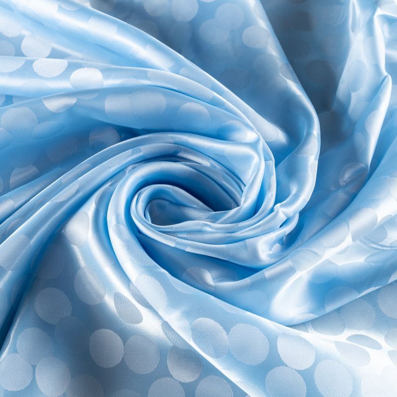 Подкладочная ткань легкая, с жаккардовым крупным "горохом",  голубого оттенка, с красивым блеском. Не  просвечивает, хорошо скользит. Подойдет для изготовления таких изделий, как пальто, костюмы, куртка, шуба, платье, жакет.