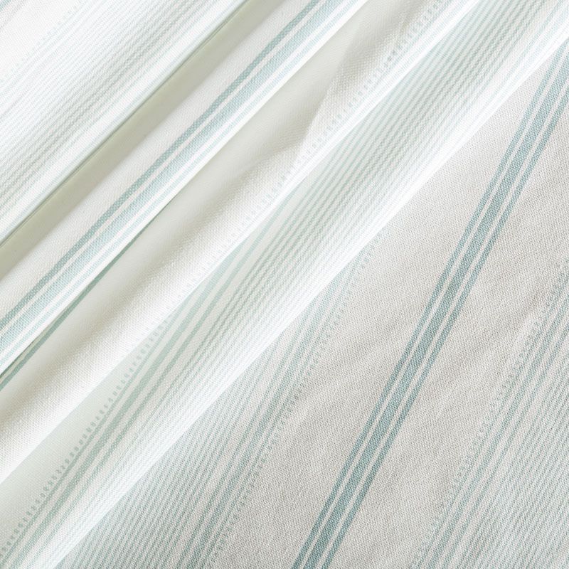 Матовая фактурная портьерная ткань в полоску, которая расположена вдоль кромки. Представлена в светло-бирюзовой палитре. Ткань средней плотности, без блеска, хорошо драпируется, имеет полонтяное переплетение. Прекрасно впишется в самые разные стилевые направления (прованс, кантри). Можно использовать для пошива портьер, римской шторы, салфеток, столового белья, подушек, покрывал и других предметов текстильного интерьера.