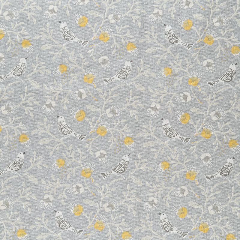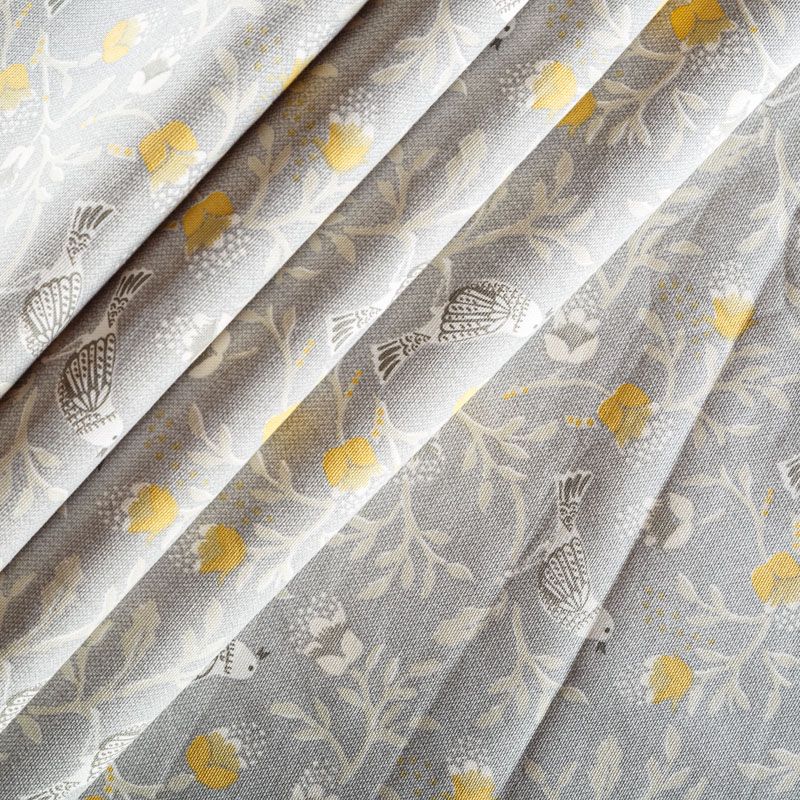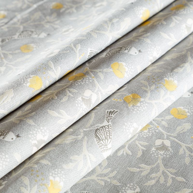 Хлопковая портьерная ткань от английского производителя. На  текстурированной серой основе наснесен принт в виде стилизованных птиц и цветов. Ткань средней плотности, прекрасно держит форму, драпируется в устойчивые складки. Подойдет для классических портьер, римских штор, покрывал, подушек, скатертей, салфеток и других элементов текстильного интерьера как в самостоятельном исполнении, так и качестве компаньона к однотонным варинтам.