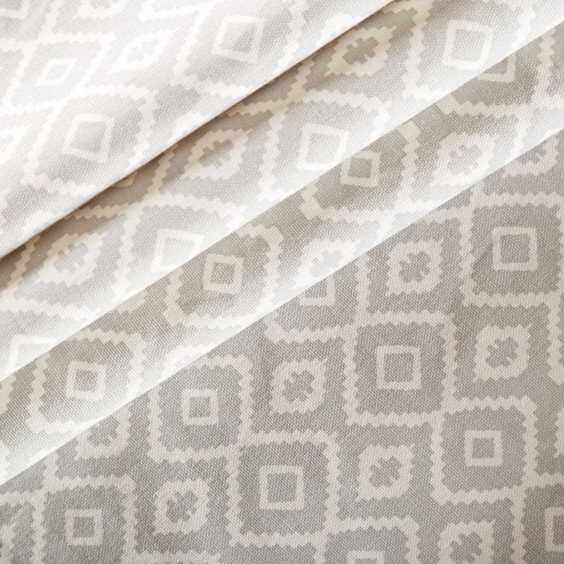 Хлопковая портьерная ткань от английского производителя. На текстурированной серой основе наснесен геометрический узор в белом цвете. Ткань средней плотности, прекрасно держит форму, драпируется в устойчивые складки. Подойдет для классических портьер, римских штор, покрывал, подушек, скатертей, салфеток и других элементов текстильного интерьера как в самостоятельном исполнении, так и качестве компаньона к однотонным варинтам.