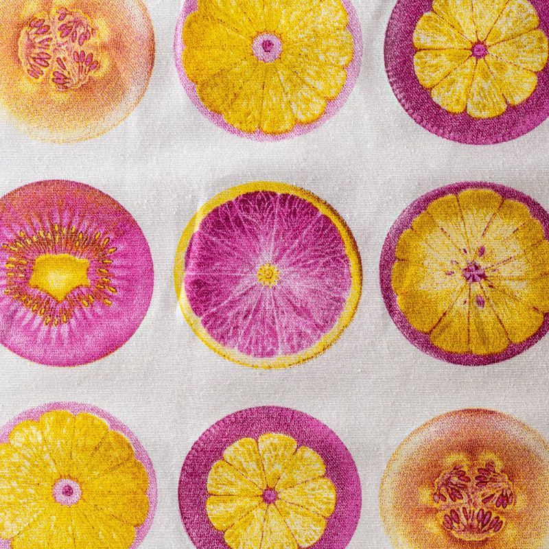 Принтованная ткань с фантазийным дизайном, выполненным на смесовой основе. Ткань подходит для оформления интерьеров в современном стиле. Яркие фрукты, выполненные в розово-желтых оттенках представлены на рубчатой плотной основе полотняного плетения. Ткань подойдет для пошива портьер, римской шторы, покрывала, чехлов для мебели, скатертей, салфеток, подушек.