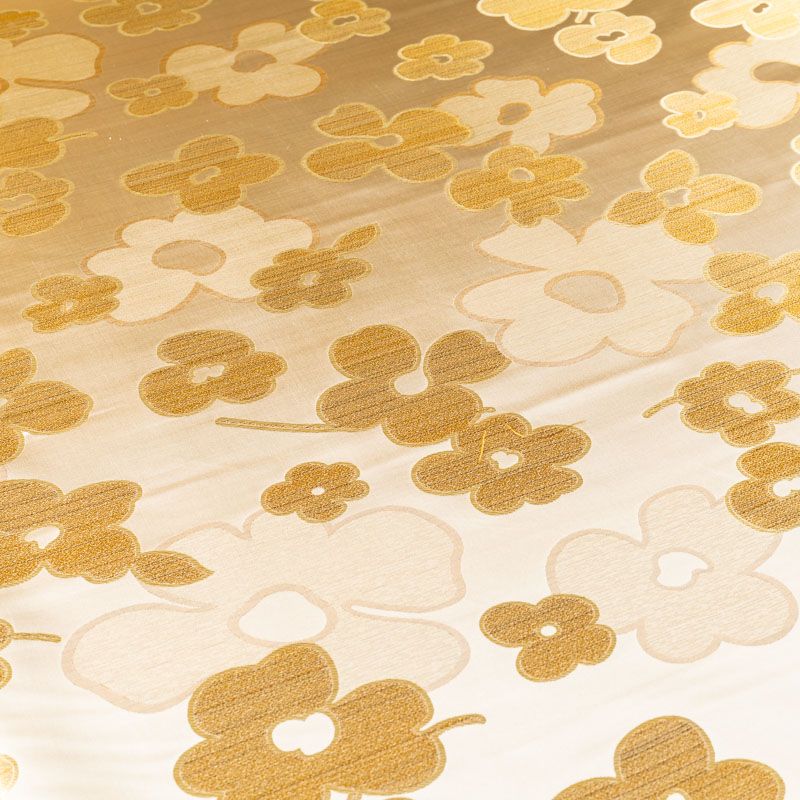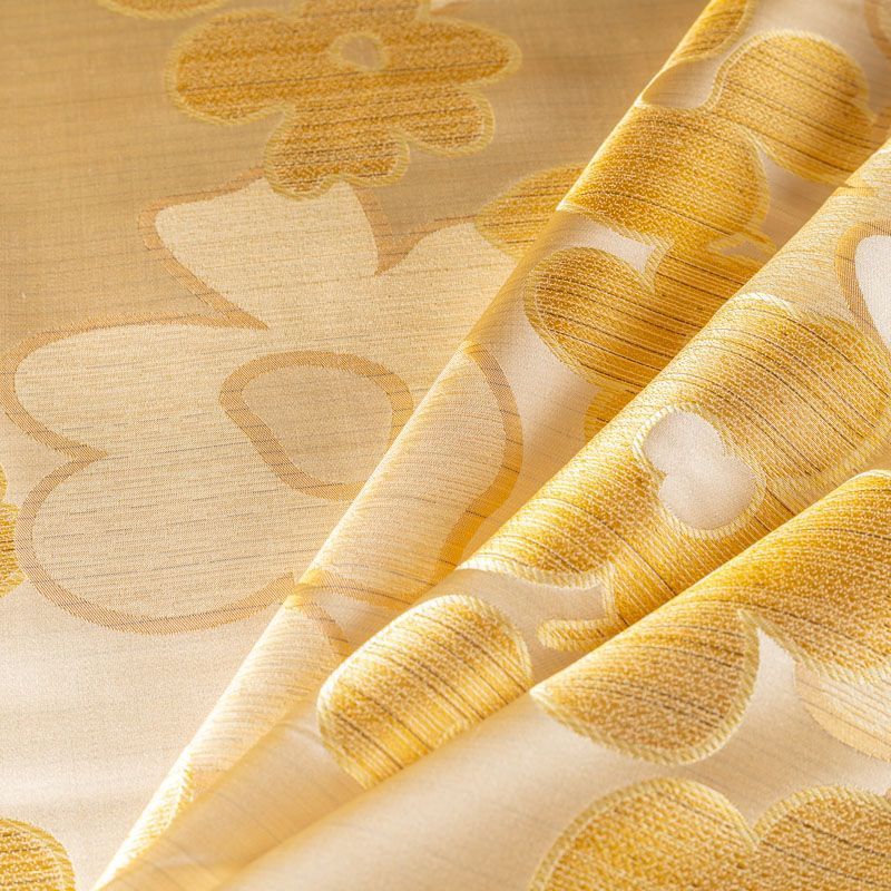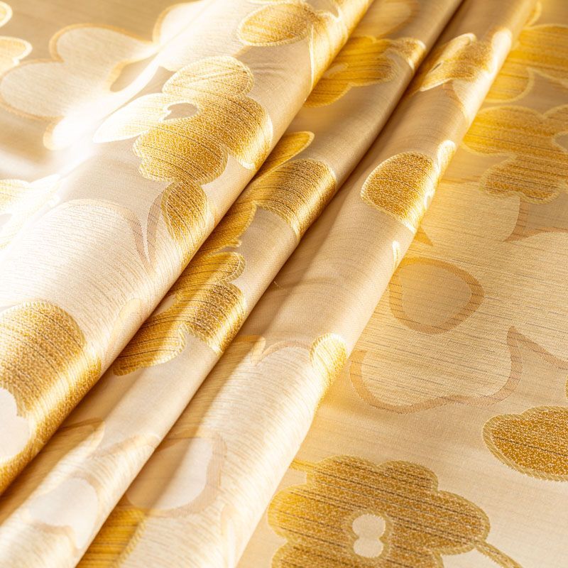 По своей структуре шелковые портьерные ткани являются мягким и красивым материалом, способным отражать свет. Изделия из шелка удивительно переливаются и блестят, придавая интерьеру помещения особую атмосферу и вид. Такие портьерные ткани лучше всего применять для создания покрывал, наволочек, штор, легких, воздушных и светлых – они отлично подойдут для затемненных мест либо закрытых окон. Ткань имеет стилизованный цветочный рисунок в оттенках золотого и горчичного цветов, а так же сочетает в себе чередование матовой и блестящей текстур.