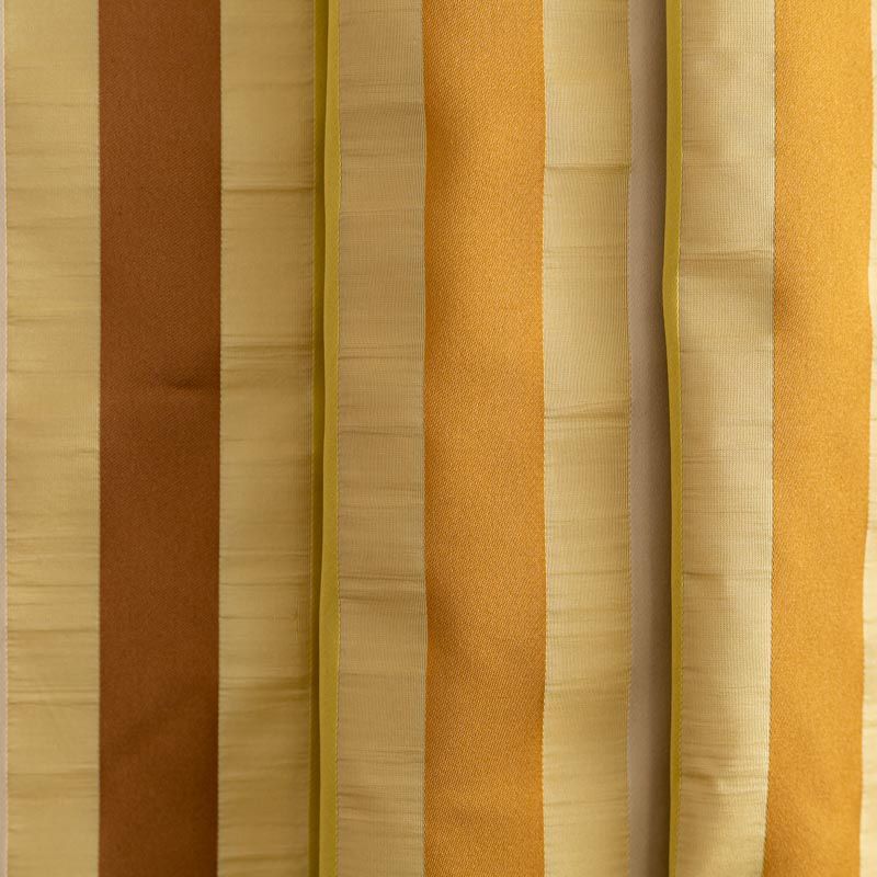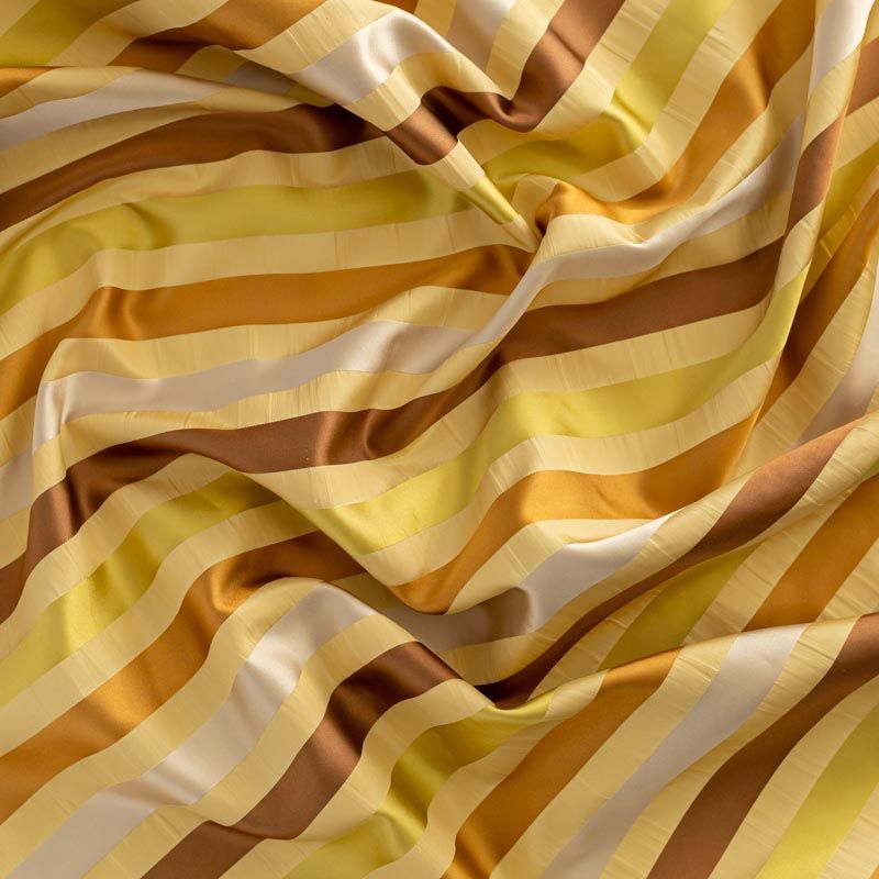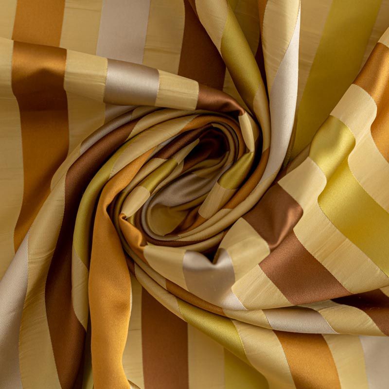По своей структуре шелковые портьерные ткани являются мягким и красивым материалом, способным отражать свет. Изделия из шелка удивительно переливаются и блестят, придавая интерьеру помещения особую атмосферу и вид. Такие портьерные ткани лучше всего применять для создания покрывал, наволочек, штор, легких, воздушных и светлых – они отлично подойдут для затемненных мест либо закрытых окон. Золотистая шелковая ткань с узкими поперечными полосками прекрасно подойдет для небольшого помещения. Такой принт визуально расширит пространство.