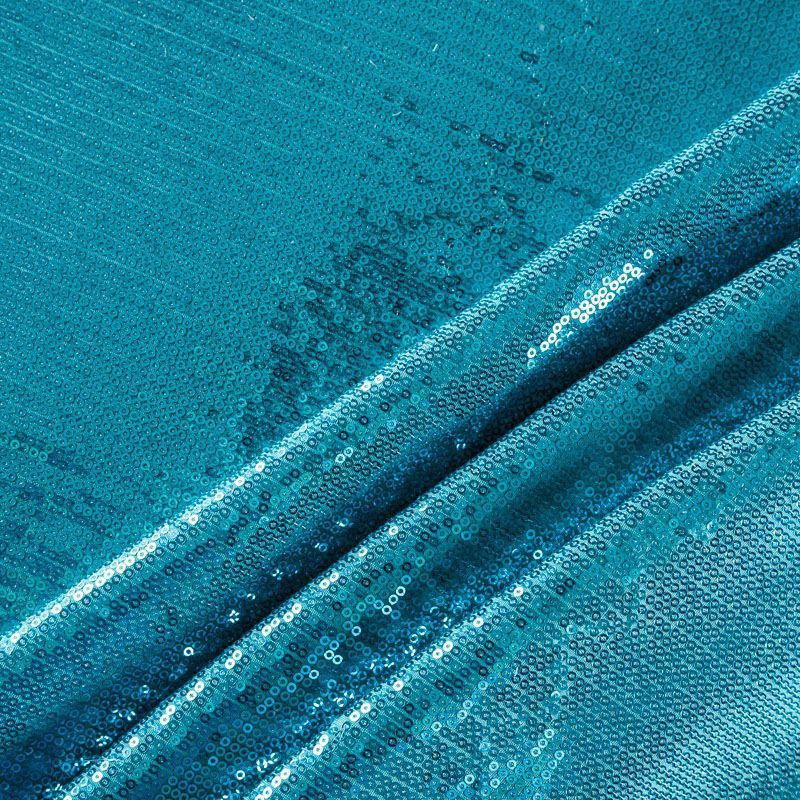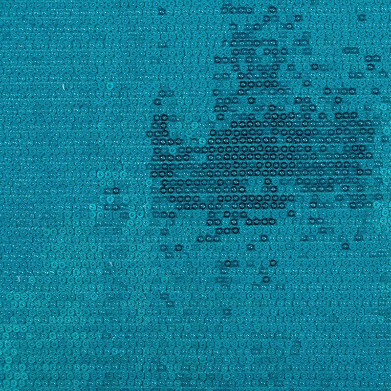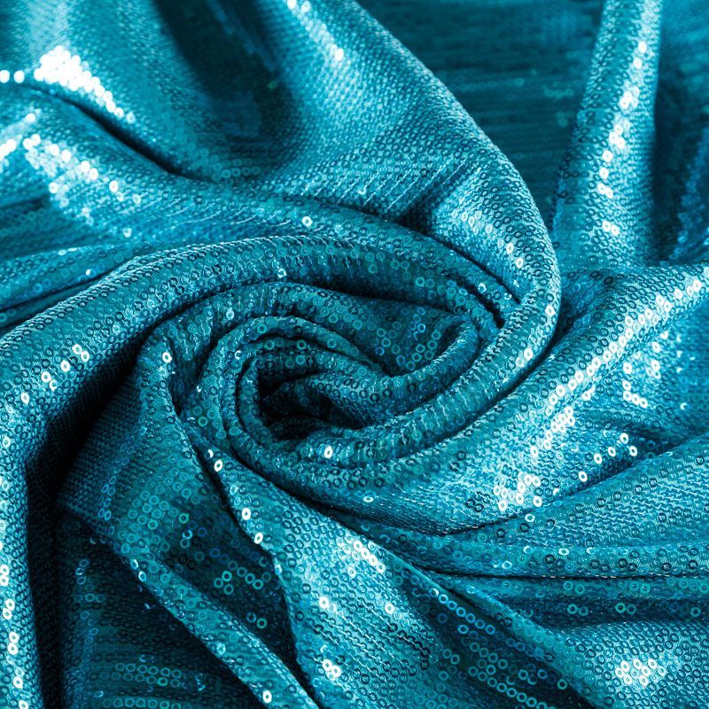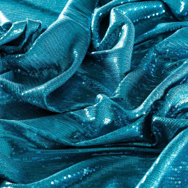 Блестящие пайетки ярко-голубого оттенка. Мелкие, размером около 3 мм. Основа - трикотажное полотно, комфортное в носке. Ткань не прозрачная, тянется.  Подойдет для вечернего коктельного платья или юбки, комбинезона, топа, танцевальных и сценических костюмов.