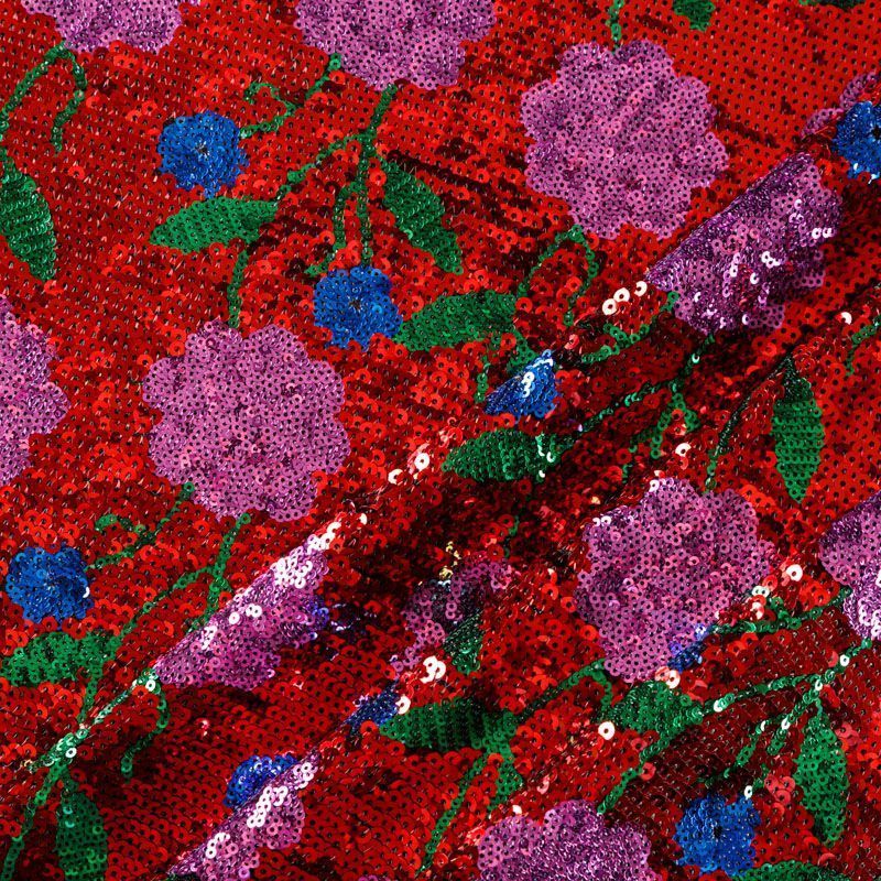 Эластичная сетка черного цвета по всей поверхности усеяна глянцевыми пайетками, который образуют яркий цветочный рисунок на красном фоне. Ткань очень хорошо драпируется, красиво переливается, имеет глянцевый блеск, пластичная и эластичная. Пайетки — идеальный материал для праздников и вечеринок. Из них получится эффектное платье, жакет, боди, туника, юбка или комбинезон.