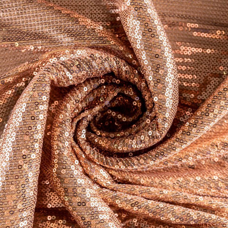 Блестящие пайетки бронзового оттенка. Мелкие, размером около 3 мм. Основа - трикотажное полотно, комфортное в носке. Ткань не прозрачная, тянется. Подойдет для вечернего коктельного платья или юбки, комбинезона, топа, танцевальных и сценических костюмов.