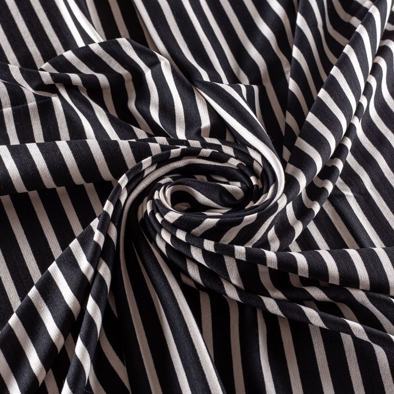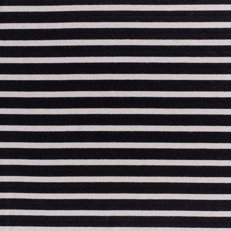Итальянский трикотаж "пенье" из вискозы в черно-бежевую горизонтальную полоску. Поверхность гладкая и матовая. Ткань очень плотная за счет плетения, пластичная, хорошо тянется, не просвечивает. Прекрасно подойдет для пошива лонгслива, футболки, кардигана, платья или юбки в спортивном стиле.