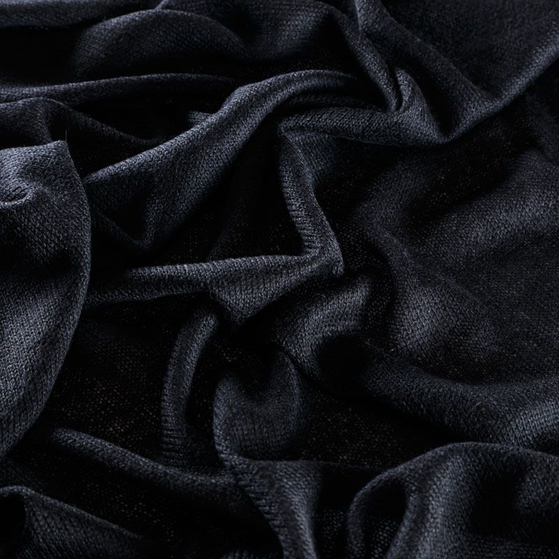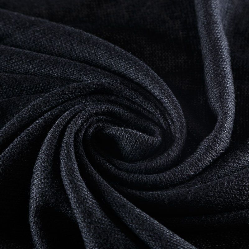 Итальянский шерстяной вязаный трикотаж черного цвета средней плотности и прозрачности. Ткань легкая, мягкая, не колется, приятная на ущупь, уютная и теплая. Идеально подойдет для пошива водолазки, свитера, кардигана, а также для шарфа, снуда.