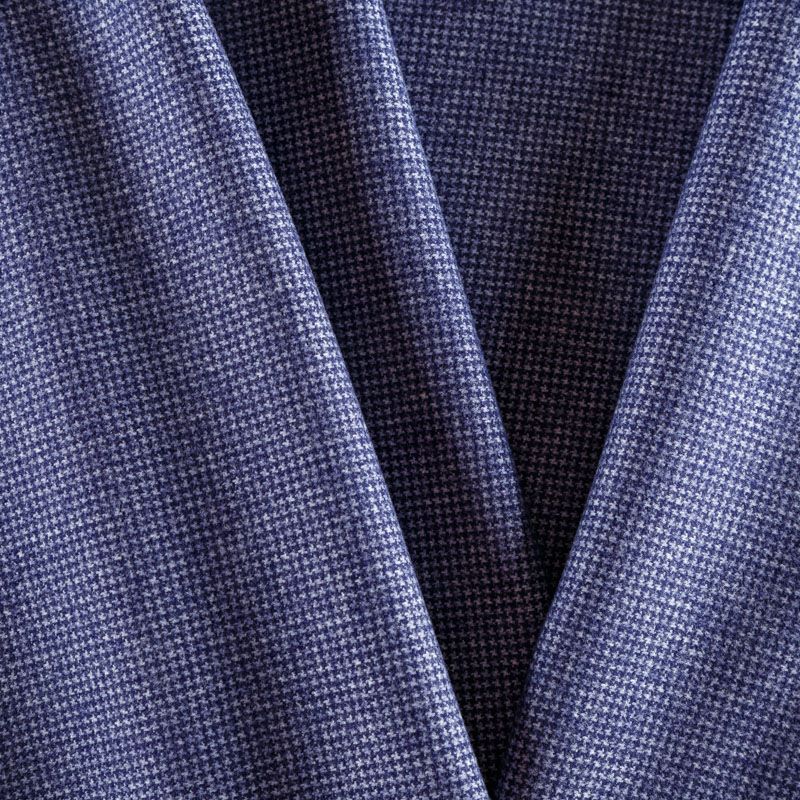 Трикотаж средней толщины, хорошо тянется за счет эластана в составе. Мелкий ненавязчивый узор "гусиная лапка" образуется переплетением фиолетово-синих и белых нитей. Ткань не сухая, мягкая, но плотная, не просвечивает, теплая, хорошо драпируется. Отлично подойдет для пошива легкой верхней одежды, жакетов, костюмов, юбок.