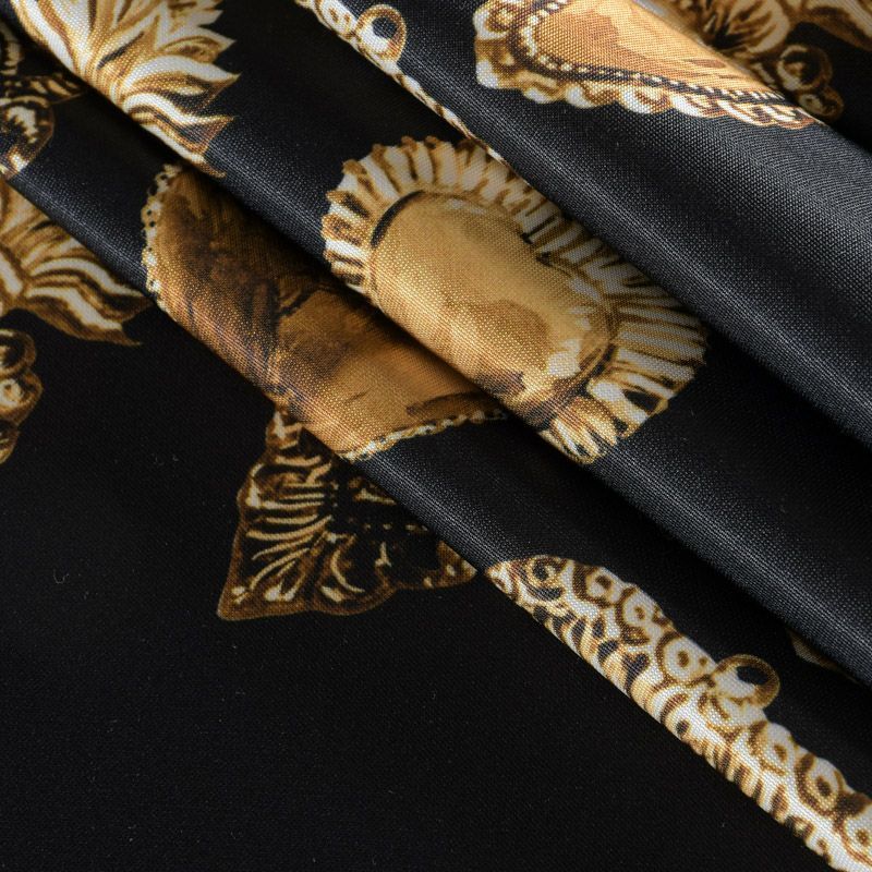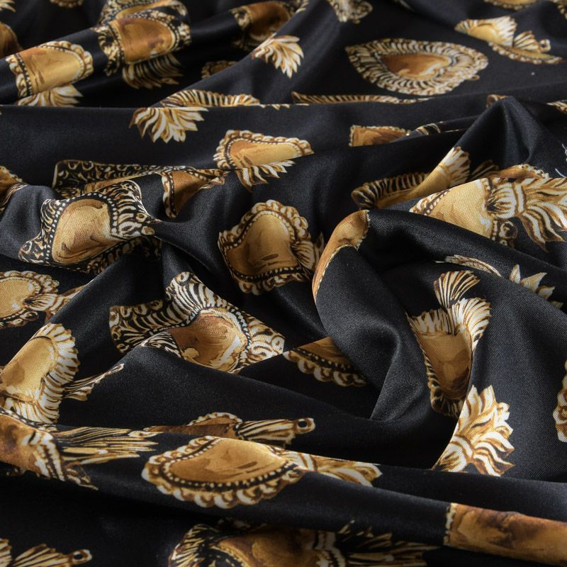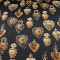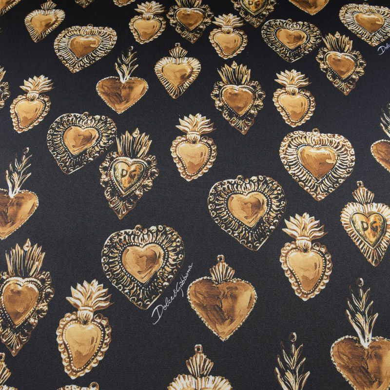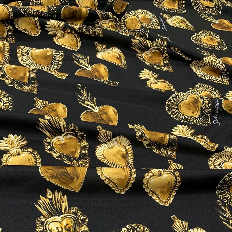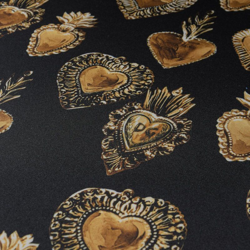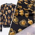 Итальянский трикотаж с принтом от известного бренда черного цвета с "золотой" бижутерией в виде сердец. Материал гладкий с лицевой и изнаночной сторон, мягкий и комфортный, достаточно эластичный, не мнется. Хорошо садится по фигуре, после растяжения быстро возвращается к прежней форме. Подойдет для пошива толстовки, спортивного костюма, джоггеров, шорт, свитшота, кроп-топа, платья в спортивном стиле и облегающего силуэта.
