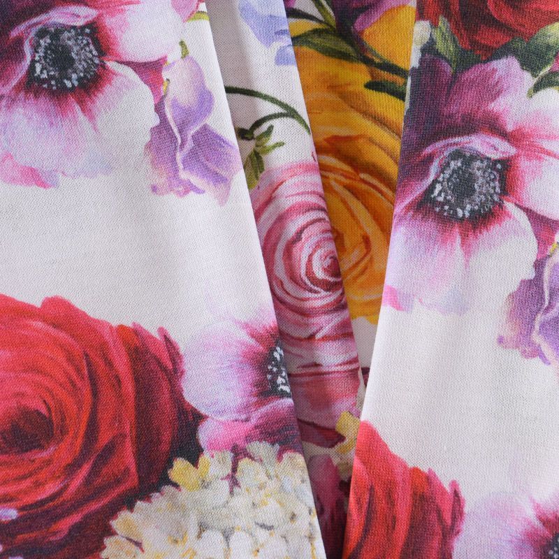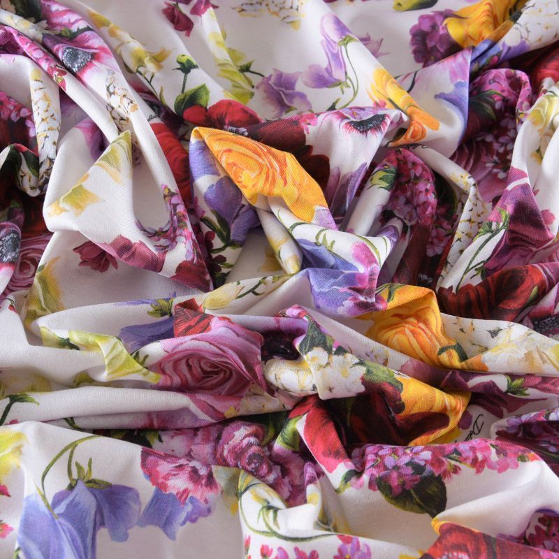 Итальянский брендовый трикотаж из хлопка с добавлением эластана белого цвета с ярким цветочным принтом. Полотно достаточно тонкое и легкое, слегка просвечивает. Материал мягкий, пластичный, хорошо растяжимый. Подойдет для пошива футболок, лонгслива, топов, спортивных платьев, домашней одежды.