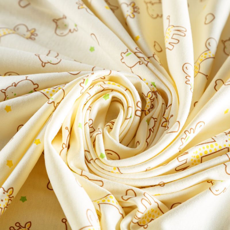 Хлопковый трикотаж качества пенье с детским принтом. Поверхность ткани гладкая, полотно средней плотности, не толстое, мягкое и нежное на ощупь, тянется за счет эластана в составе. Прерасно подойдет для пошива детской одежды, постельного белья и комплектов в кроватку, пижамы, домашней и летней одежды.