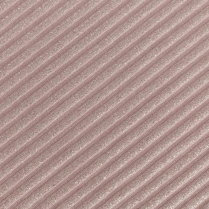 Трикотаж-лапша средней плотности, с высокой степенью эластичности, поверхность рельефная за счет эффекта резинки и мерцающая за счет металлизированного напыления. С изнанки трикотаж гладкий, комфортный, подходит для использования без подклада. Сшить из такого полотна можно водолазки, платья, топы, юбки, комплекты, нарядные изделия. Направление полос - вдоль линии кромки.