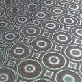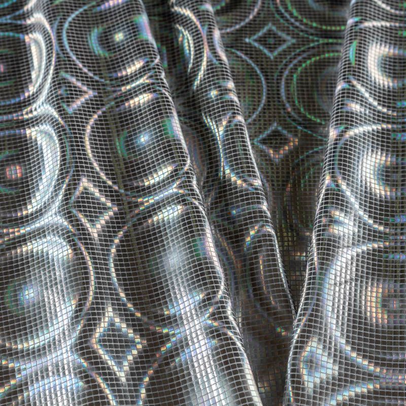 Эффектное трикотажное полотно с напыленными разноцветными блестками. Поверхность фактурная с геометрическим рисунком, который не деформируется при растяжении трикотажа. Материал очень пластичный, образует струящиеся мягкие складки, отлично тянется, не просвечивает, не мнется. Изнаночная сторона матовая, приятная на ощупь. Идеальный выбор для нарядных моделей, гимнастических и танцевальных костюмов.
