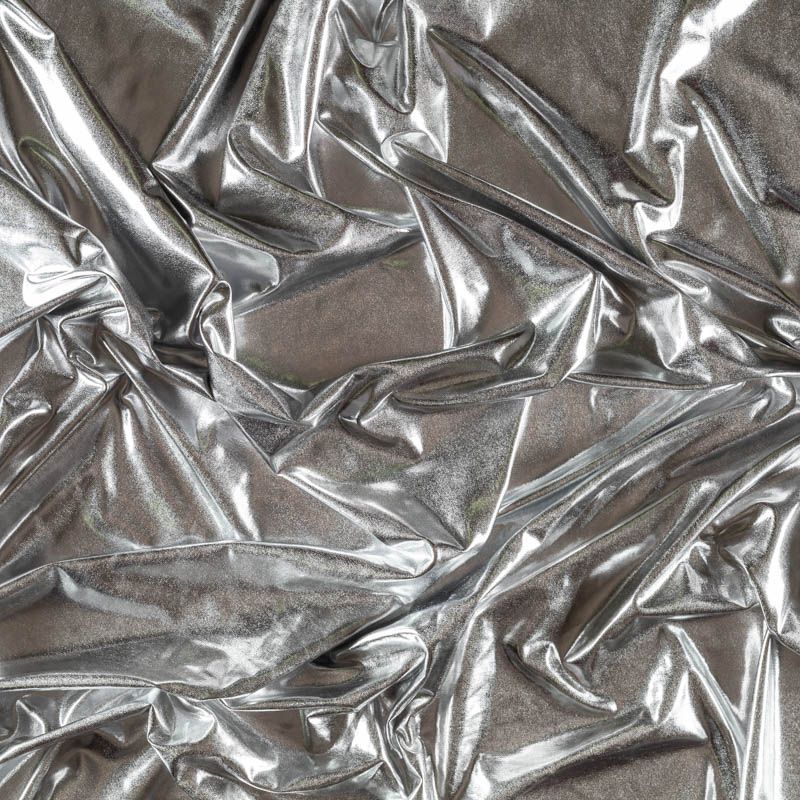 Эффектное трикотажное полотно с серебряным металлическим блеском. Материал очень пластичный, образует струящиеся мягкие складки, отлично тянется, не просвечивает, не мнется. Изнаночная сторона матовая, приятная на ощупь. Идеальный выбор для нарядных моделей, гимнастических и танцевальных костюмов.