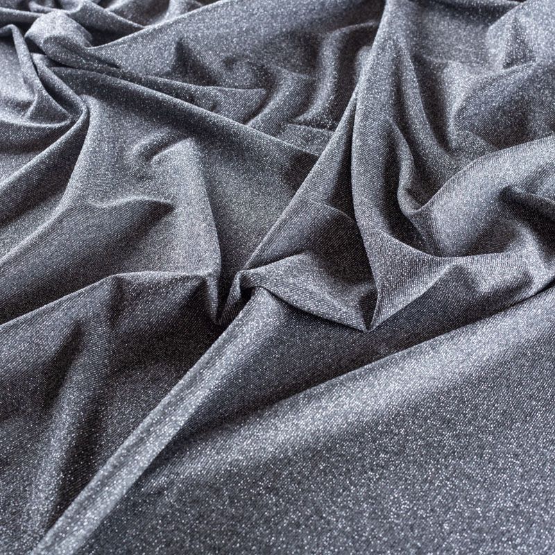 Итальянский вискозный трикотаж серого оттенка с добавлением серебристой люрексной нити. Поверхность шероховатая на ощупь, ткань очень плотная за счет плетения, пластичная, хорошо тянется, не просвечивает. Прекрасно подойдет для пошива лонгслива, гольфа, футболки, кардигана, платья или юбки в спортивном стиле.