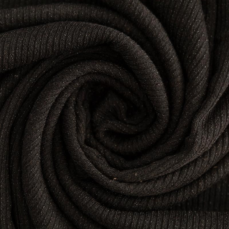 Трикотаж-лапша черного цвета с серебристой люрексовой нитью. Мягкая и эластичная ткань, великолепно драпируется и красиво облегает. Прекрасно подходит для изделий по фигуре, а также нарядов с мягкими складками. Трикотаж можно использовать для вечерних образов — платья, блузки, топы, кардигана и боди.