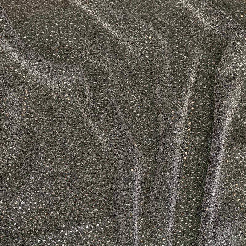 Трикотаж серебристого цвета с люрексовой нитью и мелкими пайетками. Мягкая и эластичная ткань, великолепно драпируется и красиво облегает. Тонкий, просвечивает, требуется подклад. Прекрасно подходит для изделий по фигуре, а также нарядов с мягкими складками. Трикотаж можно использовать для вечерних образов — платья, блузки, топы, кофточки и боди и для пошива танцевальных и сценических костюмов.