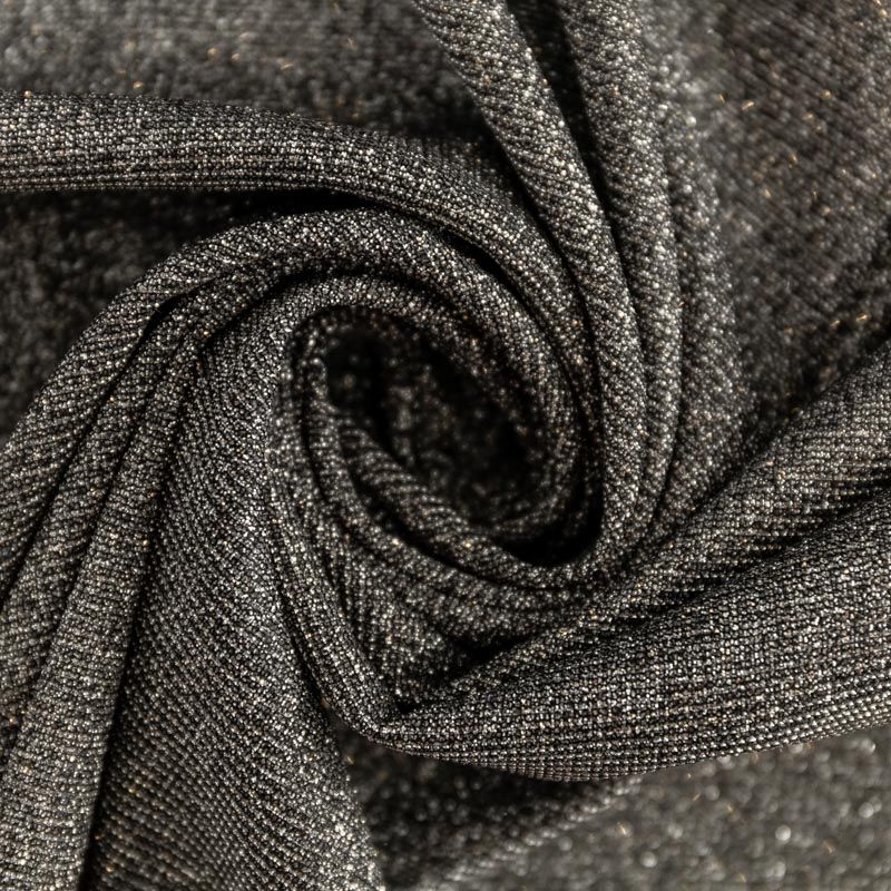Мягкое и эффектное трикотажное полотно с металлизированным напылением. Структура полотна плотная, легко растяжимая, эластичная. С лицевой стороны поверхность ткани  слегка шероховатая на ощупь, характеризуется заметным блеском «металлик». С изнанки трикотаж гладкий, комфортный, подходит для использования без подклада. Отлично пододет для пошива водолазки, платья, топа, леггинсов, спортивных купальников, нарядных изделий.
