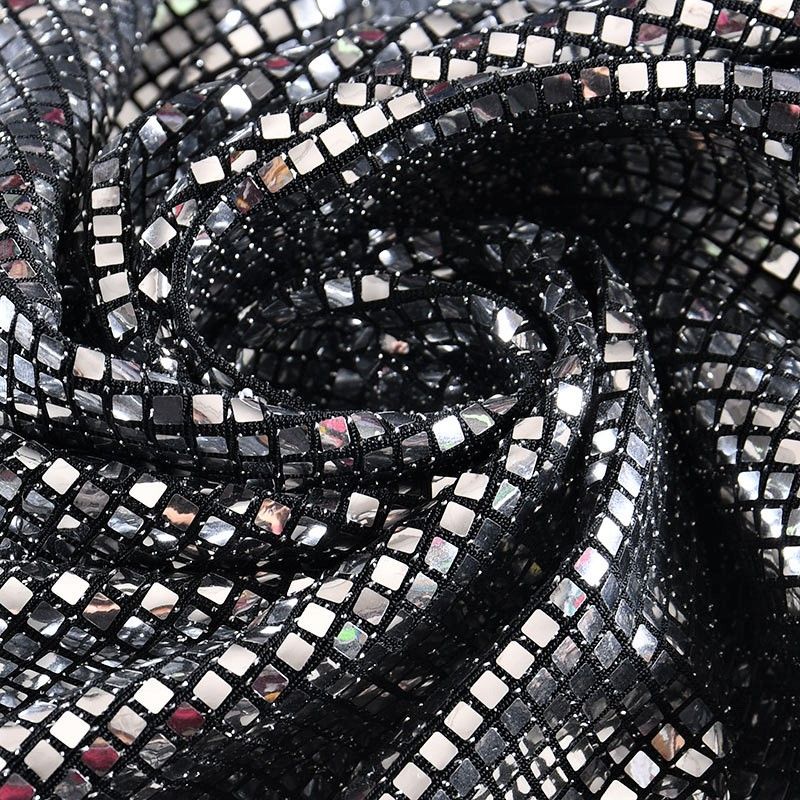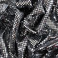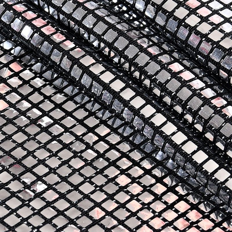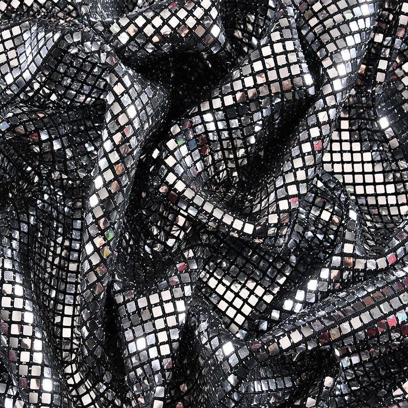 Трикотажное черное полотно с блестящими зеркальными серебристыми квадратными пайетками. Декор накатан на основу, поэтому будет комфортен в носке. Ткань пластичная, прекрасно драпируется и укладывается в складки, легко садится по фигуре за счёт основы с эластаном, не прозрачная, позволит шить изделия без подклада. Идеально подойдет для пошива нарядных вечерних образов: платья, юбки, топа, туники, широких брюк, жакета, кардигана.
