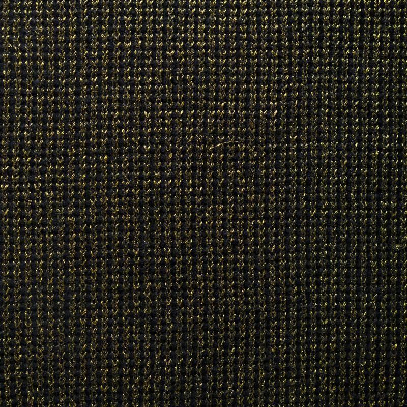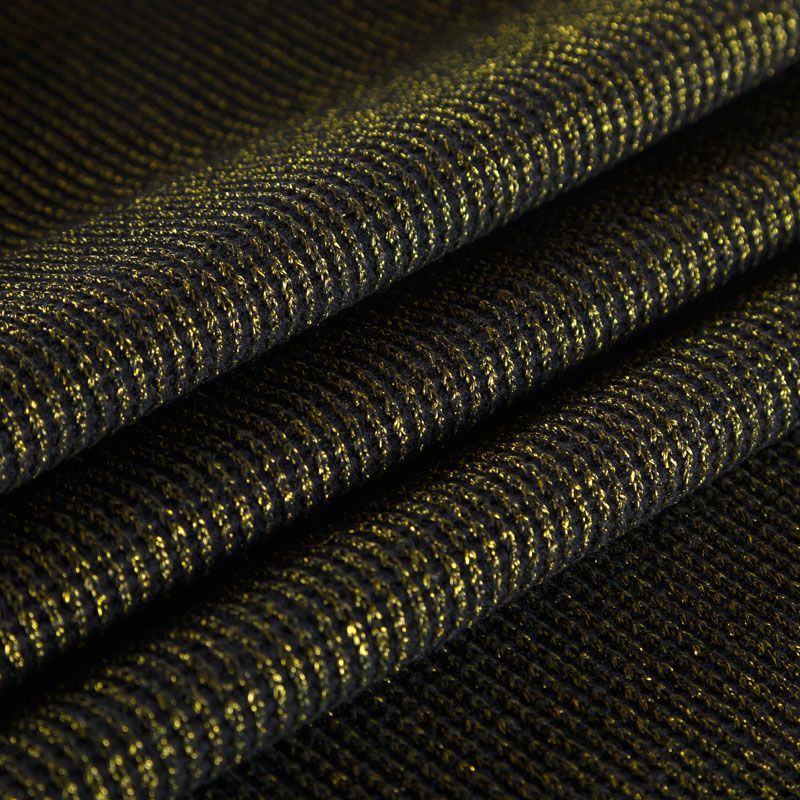 Плотный итальянский вязаный трикотаж с добавлением шерсти и золотистой люрексной нити. Полотно не рыхлое, тяжеловатое за счет плотной вязки английской резинкой, упругое, хорошо держит форму. Подойдет для пошива свитера, теплого прямого платья или юбки, жилета, кардигана, куртки, пальто или бомбера с утеплителем.