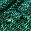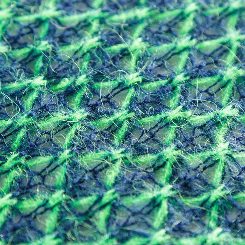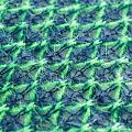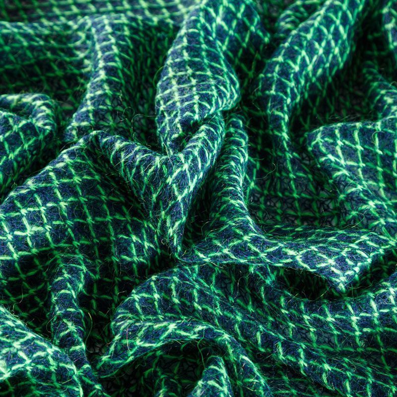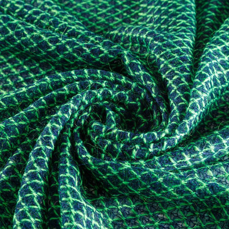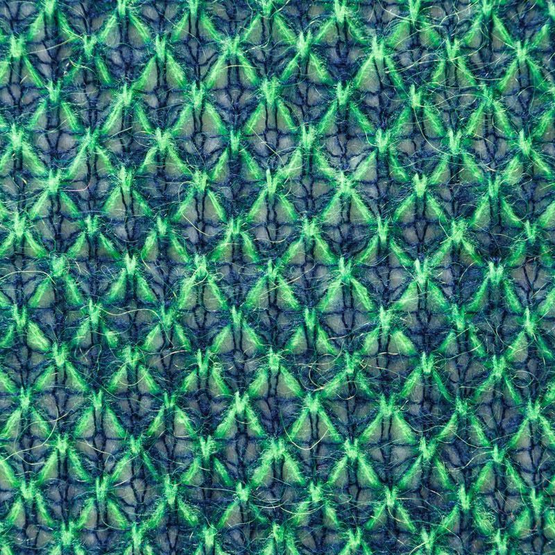 Итальянский шерстяной ажурный вязаный трикотаж темно-синего цвета декорирован яркой зеленой нитью, которая имитирует сетку. Полотно очень легкое, мягкое, воздушное, не колется, прозрачное за счет плетения, может потребоваться подклад. Идеально подойдет для пошива водолазки, свитера, платья, кардигана, а также для шарфа, снуда.