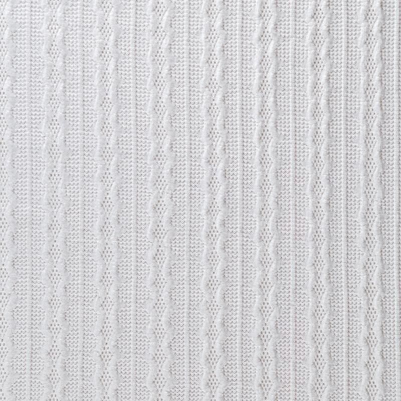 Текстурное вязаное, мягкое, пластичное полотно средней плотности в молочном оттенке. Вязаный узор - стилизованая косичка с полосками расположен по всему полотну. Подойдет для пошива уютного свитера, кардигана, юбки, платья, водолазок, снудов и головных уборов.