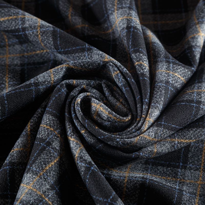 Фактурная и плотная твидовая ткань с добавлением хлопка в красивую серо-черную клетку с тонкими цветными полосками. Ткань мягкая, пластичная, приятная на ощупь. Хорошо драпируется и образует формоустойчивые складки. Твид отлично подходит для пошива костюмов, пальто, пиджаков, брюк и курток, юбок, жилетов, головных уборов в классическом стиле.