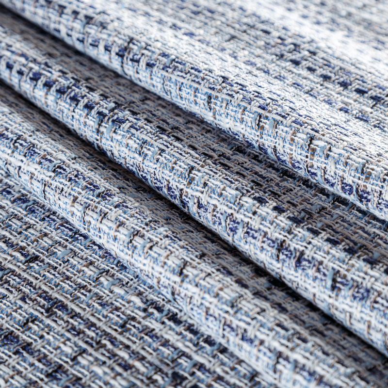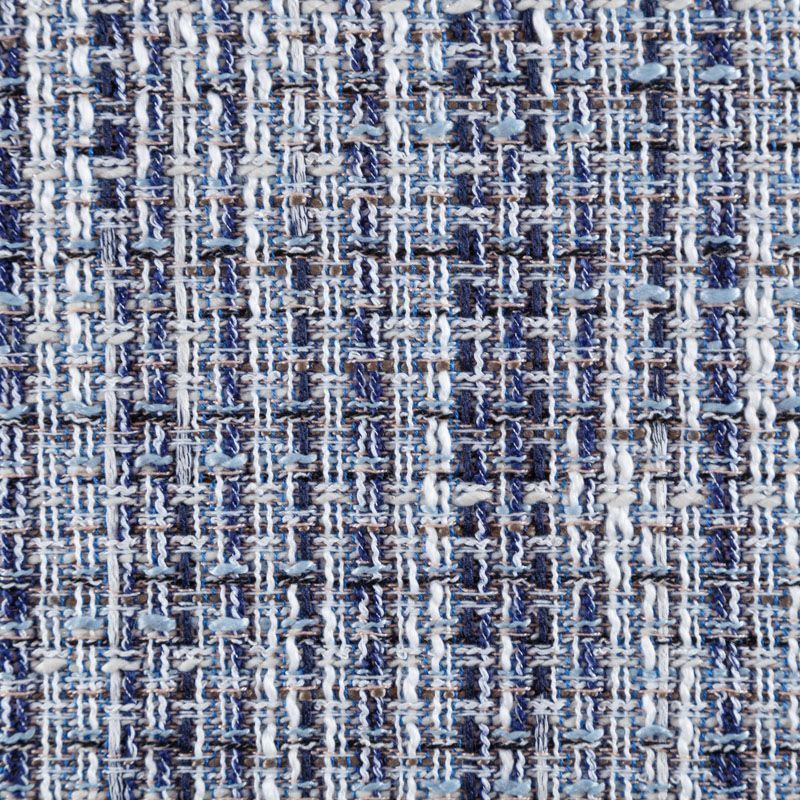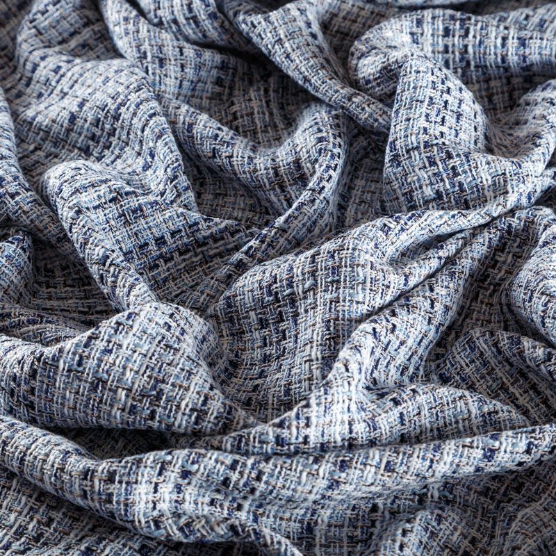 Отличительная особенность этой ткани в полотняном плетении нитей, характерного для рогожки, олицетворяющая сложную "клетчатую" геометрию в бело-голубых оттенках. Различная толщина нитей создает эффектную фактуру. Ткань неплохо держит форму, пластичная и гибкая за счет плетения, матовая, мягкая, приятная на ощупь. Прекрасно подойдет для пошива жакета, юбки, легкого пальто, костюма, жилета, кардигана, шорт.