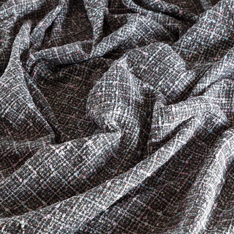 Переплетение разноцветных нитей делает эту ткань универсальной, и в тоже время оригинальной. Полотно плотное, но очень мягкое. Теплое, комфортное. Плетение рыхлое, поверхность фактурная, поэтому изделия выглядят достаточно объемно. Подойдет для пошива костюмов с юбкой, жакетов, облегченных пальто.