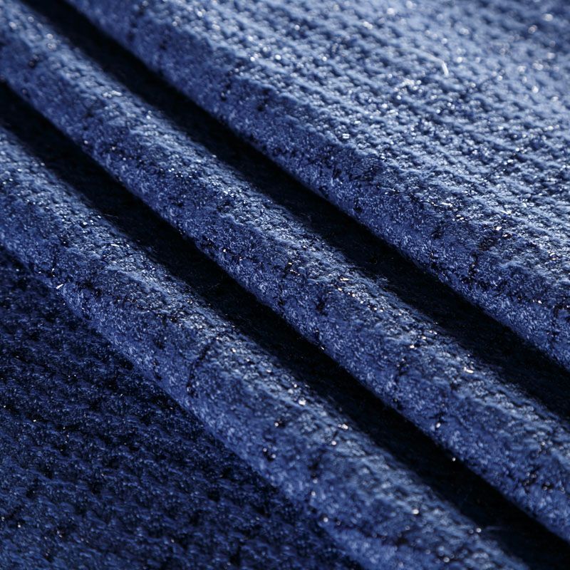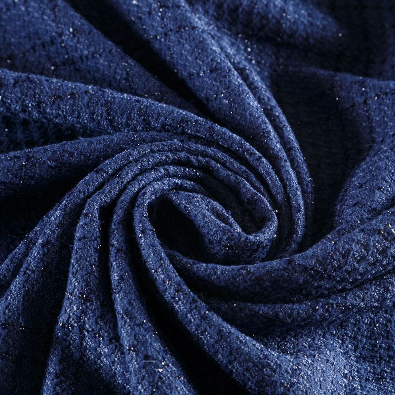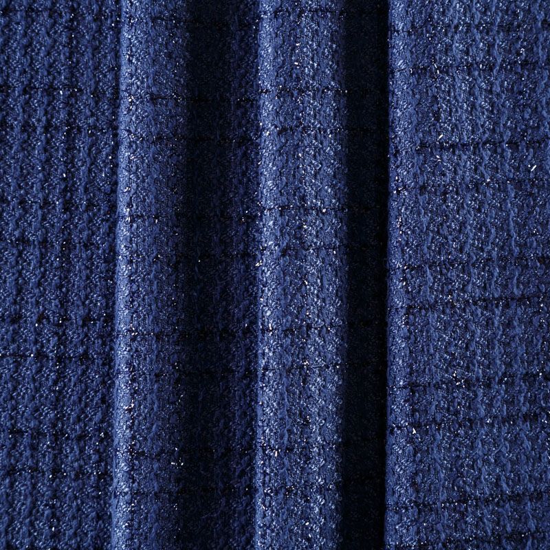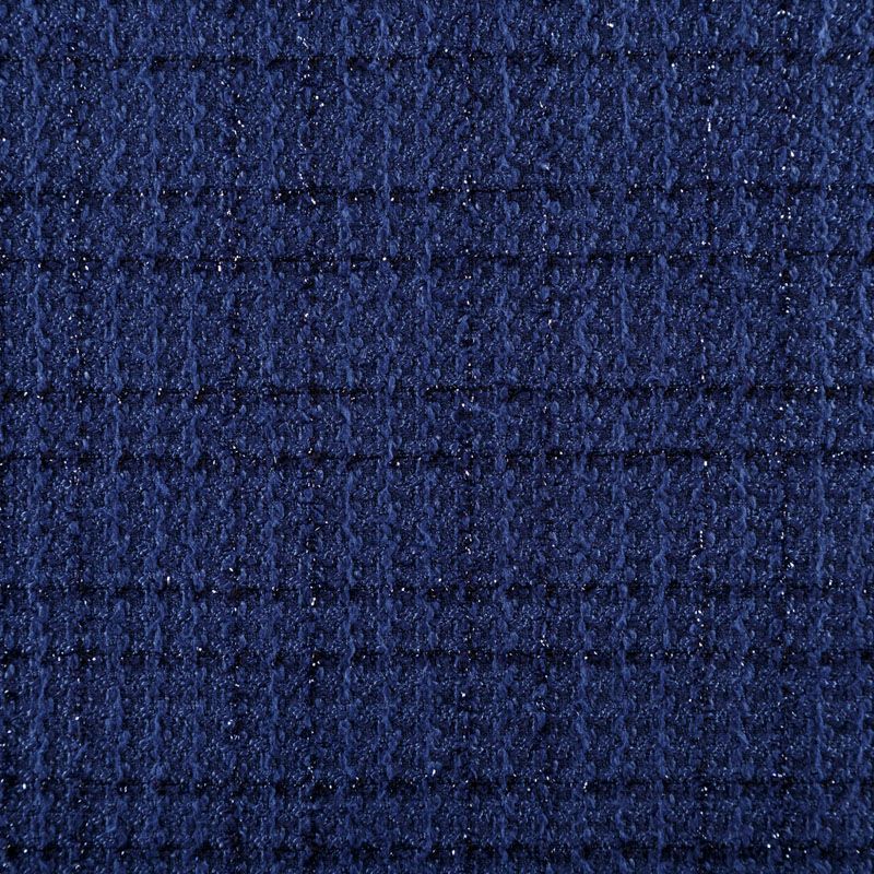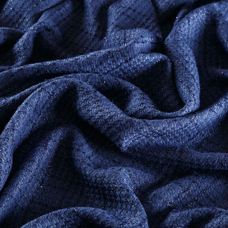 Твид средней плотности с рельефной поверхностью синего оттенка с добавлением акцента в виде люрексовой нити, которая имитирует клетку и добавляет ткани нарядности. Твид пластичный, хорошо драпируется, умеренно держит форму, прекрасно подойдет для пошива жакетов на подкладе, жилетов, кардиганов, легких пальто, юбок и платьев.