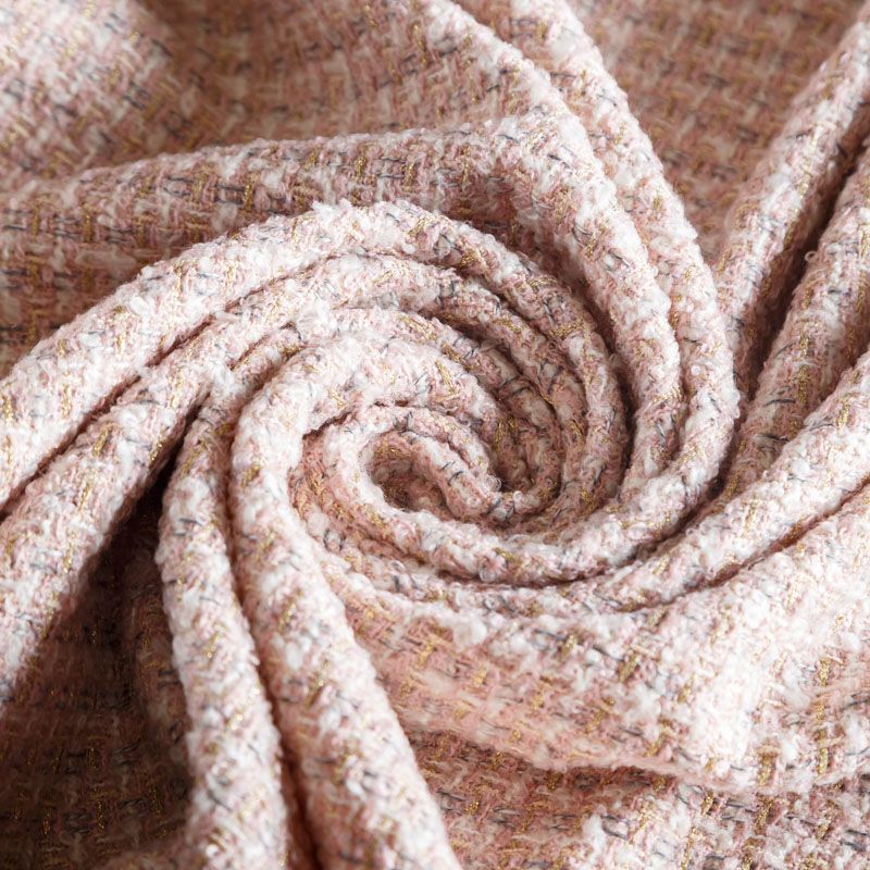 Мягкая, пластичная и объемная ткань, с разреженной и рельефной вывязанной структурой. Буклированный твид в стиле Шанель буквально соткан из различных по толщине и текстуре нитей, образующих рисунок в виде клетки. В плетение добавлена блестящая люрексная нить. Твид идеально подходит для пошива платьев, юбок, жакетов, легких пальто, эффектных бомберов и курток.