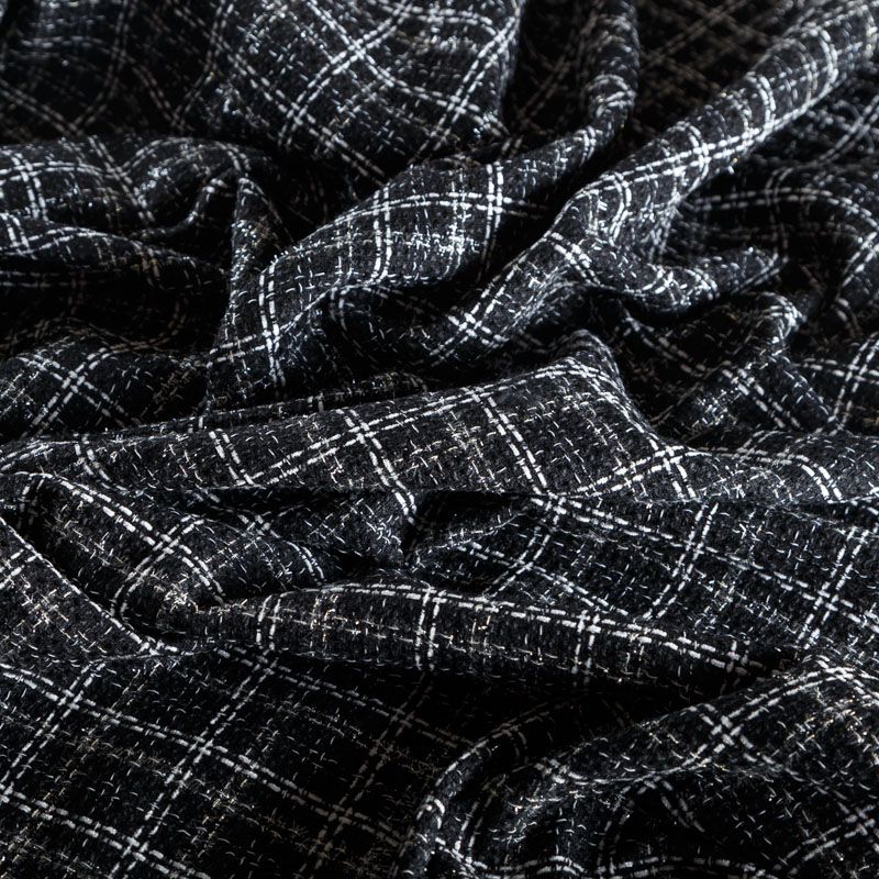 Мягкая, пластичная и объемная ткань, с разреженной и рельефной вывязанной структурой. Буклированный твид в стиле Шанель буквально соткан из различных по толщине и текстуре нитей, образующих рисунок в виде клетки. В плетение добавлена блестящая люрексная нить. Твид идеально подходит для пошива платьев, юбок, жакетов, легких пальто, эффектных бомберов и курток.