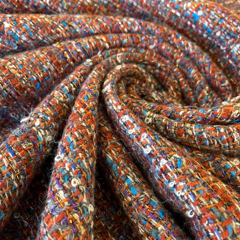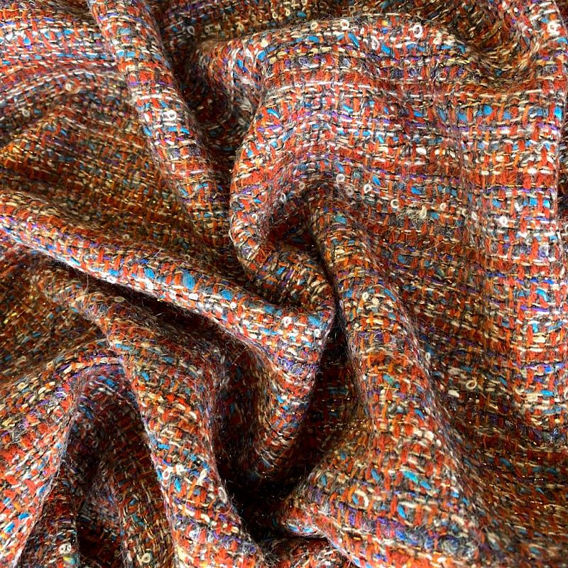 Переплетение разноцветных нитей делает эту ткань универсальной, и в тоже время оригинальной. Полотно плотное, но очень мягкое. Теплое, комфортное. Плетение рыхлое, поверхность фактурная, поэтому изделия выглядят достаточно объемно. Подойдет для пошива костюмов с юбкой, жакетов, облегченных пальто.