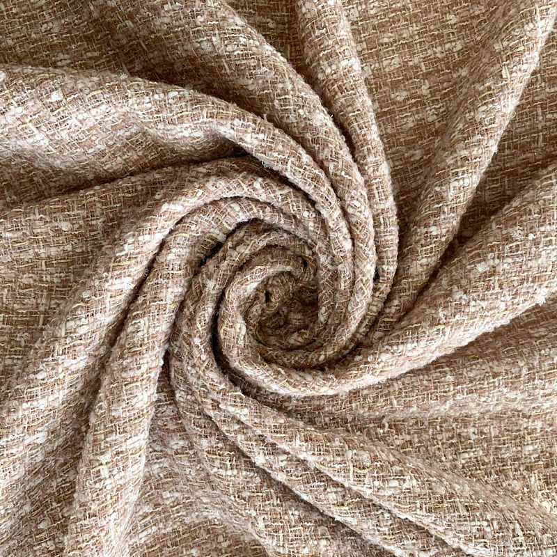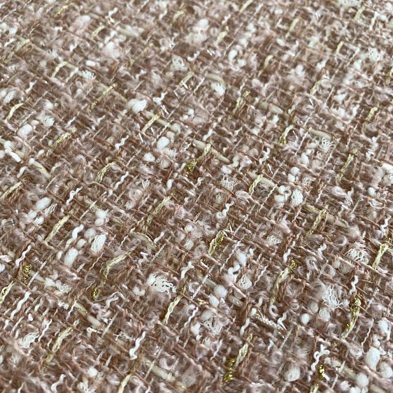 Плотная, в меру объемная ткань с легким эффектом букле из бежевых и молочно-белых нитей с добавлением акцента в виде золотистого люрекса. Мягкая, пластичная, прекрасно подойдет для пошива теплых демисезонных жакетов на подкладке, юбки и пальто.